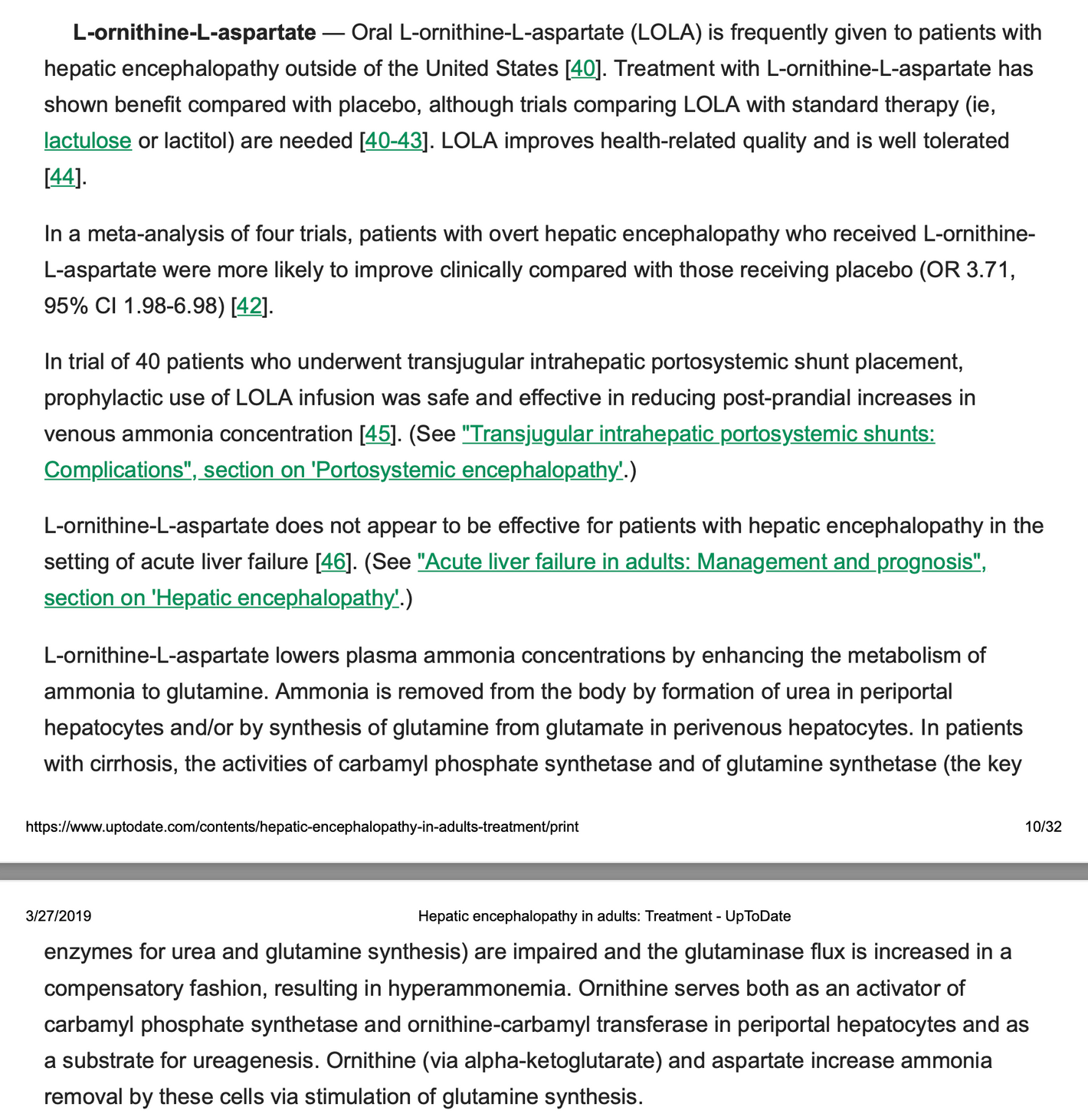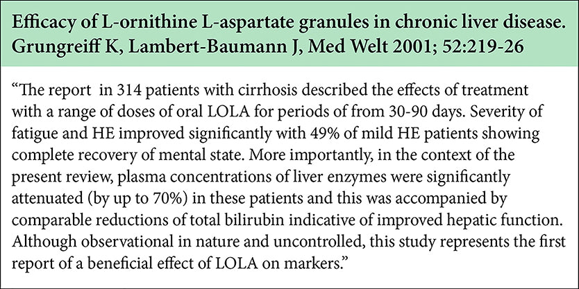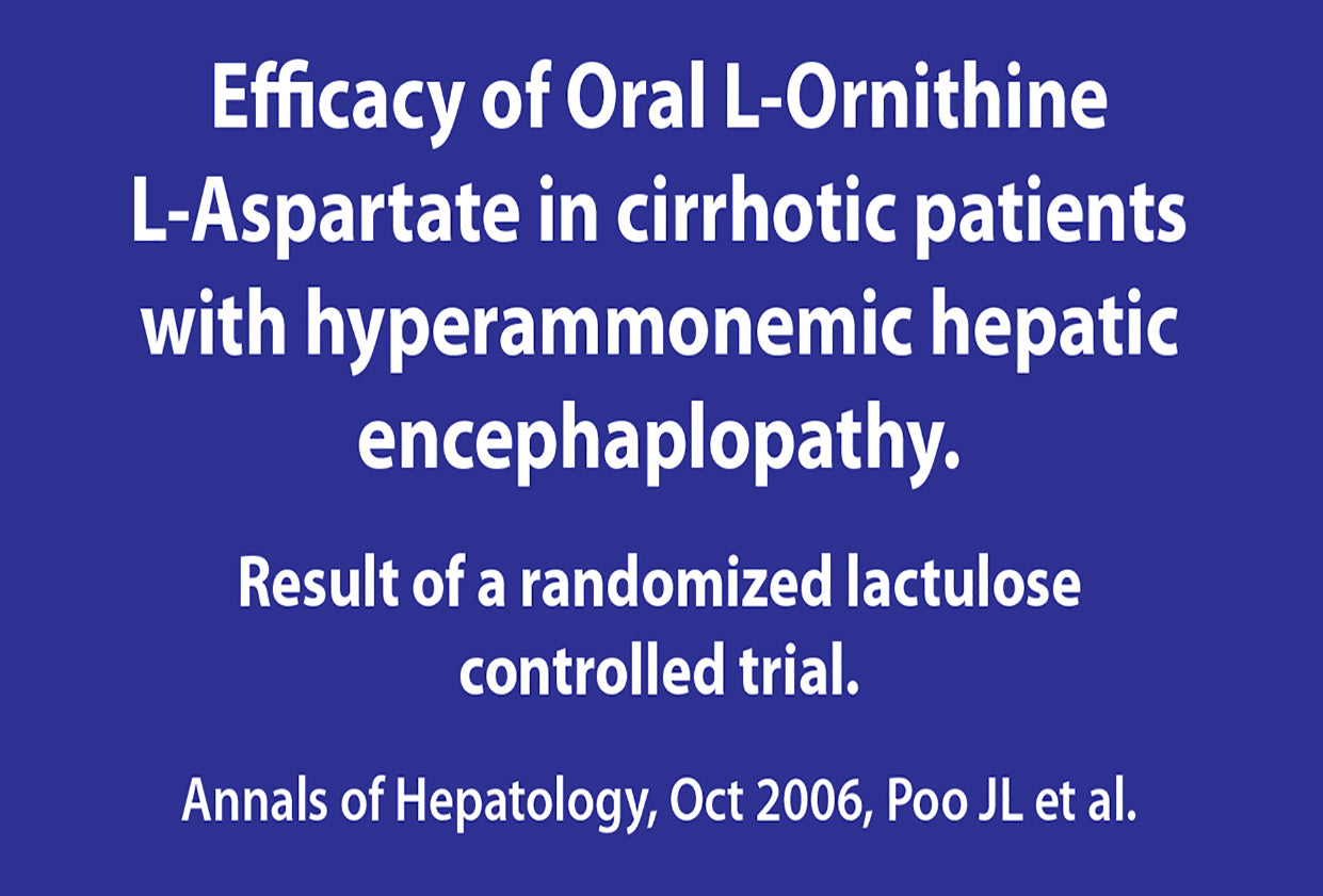 Efficacy of Oral L-Ornithine L-Aspartate in cirrhotic patients with hyperammonemic hepatic encephaplopathy. Result of a randomized lactulose controlled trial. Annals of Hepatology, Oct 2006, Poo JL et al.
